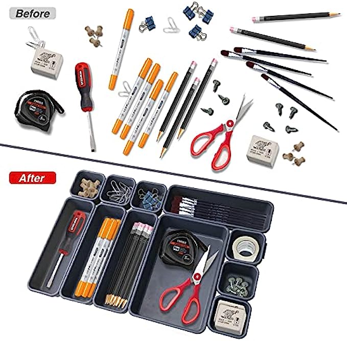 • Separate and Stackable - These sturdy desk drawer organizer set can be stacked together, or each one works alone. The interlocking feature of the junk drawer organizer help you create your own mix.Keep everything organized, No more trouble finding things.