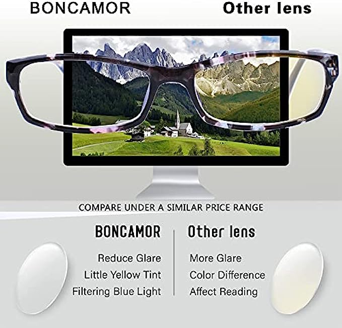 【Anti Glare UV Filter Lens】: Womens Blue light Reading Glasses with the polycarbonate material high-definition lens,Can Reduce Digital Eye Distortion, Block Blue Light, gaming and working under fluorescent lights with protection vision and glare reduction,no worry about eye fatigue, blurred vision.let. 【Fashion Design and Adjustable Spring Hinge 】:our product is made of durable TR90 material, lightweight and Flexible. The comfortable nose pad design will not make you feel uncomfortable to squeeze. A variety of Colorful to choose from, blue light ray reading glasses used in reade books/watching TV/mobile phone/ipad/computer games/work etc. 【Unisex Reading Glasses】:Square frames ,suitable for big, medium or small face.Total Width:(135mm/5.31inch) Temple Length:(130mm/5.12inch) Lens Width:(54mm/2.12inch) Lens Height:(28mm/1.10inch) Bridge Distance:(19mm/0.74inch. 【5 pairs Computer Readers for Women】:5 pack Included in a Set (Comes with a cloth bag and cleaning cloth), you can place a set of glasses where you need to read, which is convenient for daily use or which can be a exquisite gift sending to your families and friends. 【100% NO RISK WARRANTY AFTER SALE】:In order to creating greating shopping experience for our customers.Customers can return the goods for any reason and get a refund. You have no risk of buying.