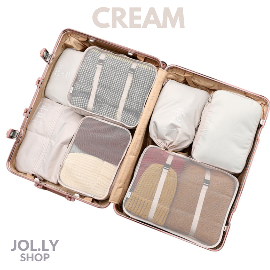 Material Quality:thin and lightweight Colour:cream and navy material is thin and light, came without any defects, zippers work. 7 in 1 includes 4 zipper bags (3 with mesh, 1 opaque), 1 shoe bag, 1 drawstring and 1 small pouch. Zipper bags are good for storing clothes.