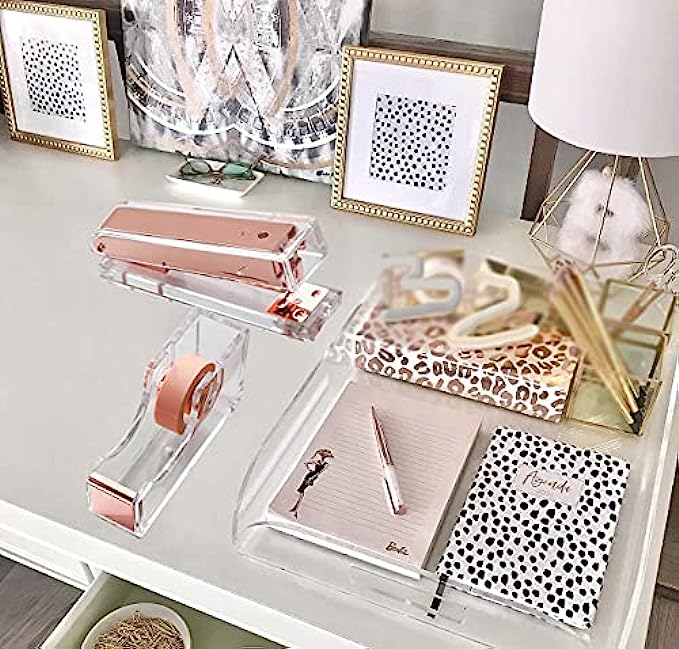 • 【DURABLE QUALITY】 High-end contemporary heavy duty acrylic and rose gold toned metal material, quality is better that usual plastic, translucent as glass, naturally elegant and beautiful, sturdy and durable office stationery set for daily use; Combining with both beauty and function, the well-designed tape dispenser is built to last.