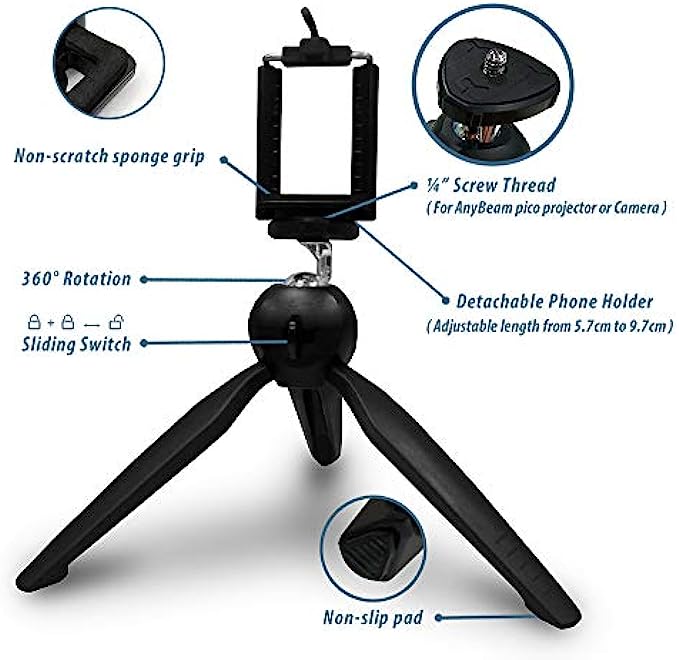 AnyBeam Mini Tabletop Tripod with Detachable Phone Holder, Compact and Lightweight, Travel Ready, Compatible with AnyBeam pico Projector, DSLRs, Compact Cameras, Phones, Webcams, Selfie Sticks