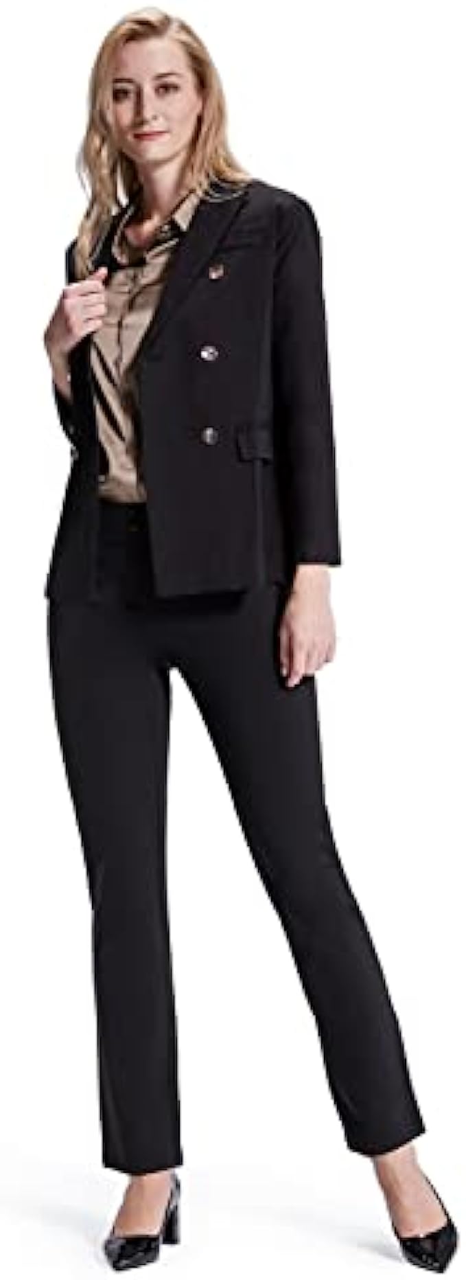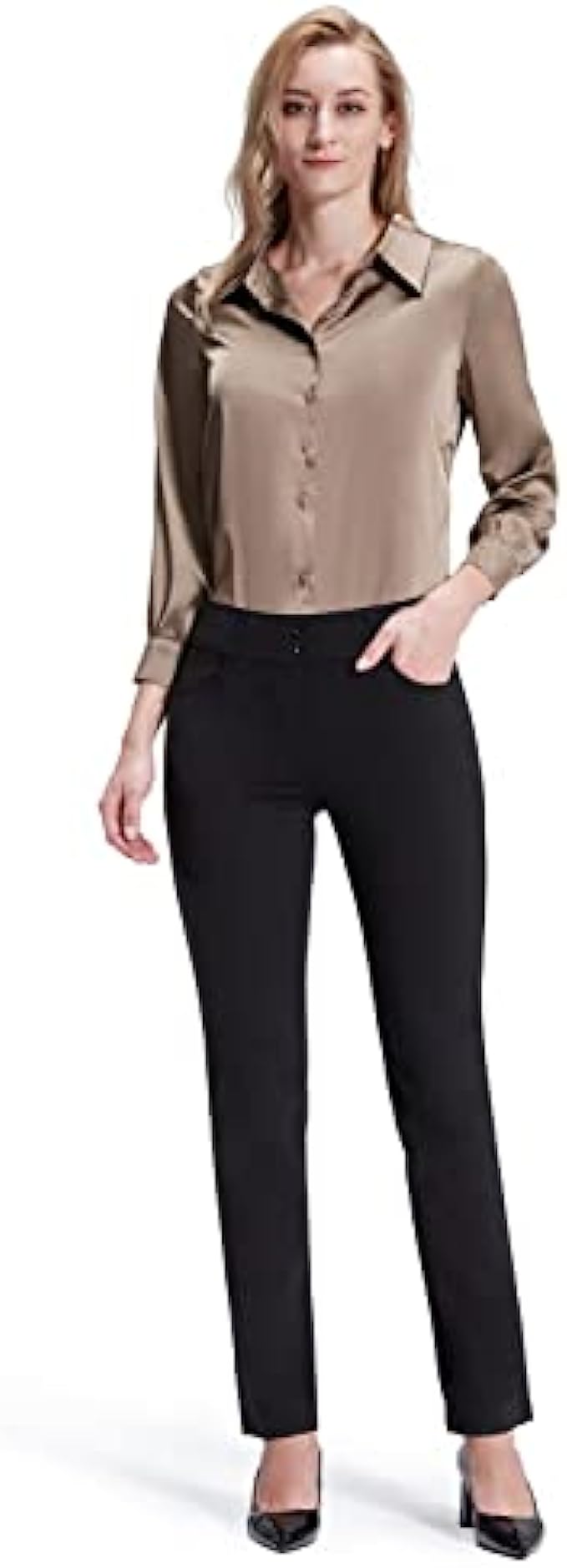 87% Polyester, 13% Spandex Imported Pull On closure Pull-on womens pants, no zippers, tummmy control for support. Easy to put on and won't fall off when you bend or squat. Unique style: stretchy waistband, false front, light-tight, wrinkle-resistant. Two decorative buttons at waist make the pants more fashionable. Straight leg design to show your streamlined appearance. The relaxed fit pants are superior comfortable and flatter many body types and shapes. Functional pockets:2 front pockets and 2 patch pockets at the back, are designed to provide enough storage to put some essentials when you go out or work. Solid black dress pants for womens can be well matched with many styles of suits to meet your needs. Appropriate for most occasions.