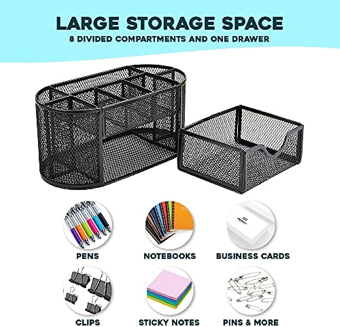 • Product Dimensions- This organizer has 8 compartments and a drawer allowing storage of almost anything office supplies! The exact dimensions are 8.6x4.3x4.1 Inches.