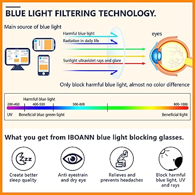 • COMPUTER BLUE LIGHT GLASSES - Blue Light Filter Glasses: Bluelight blocker, anti 95-99% of harmful blue ray and discomfort from long periods of web surfing, TV, phone, tablet, computer screen, vedio, reading and working under fluorescent lights with UV400 reduction, reduce headache, fatigue & eye strain, help you sleep better