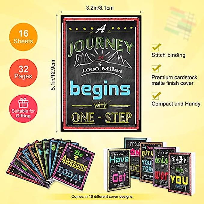 16 Motivational Notebooks - We have 16 different beautiful exquisite designs, our Notepads are bold, unique, and easy to read with their focused growth mindset slogan and eye-catching image. Each Mini notebook size measures approx. 3.2 x 5.1 inches, and has 16 sheets with 32 pages and 14 lines on every page. Pocket convenient too