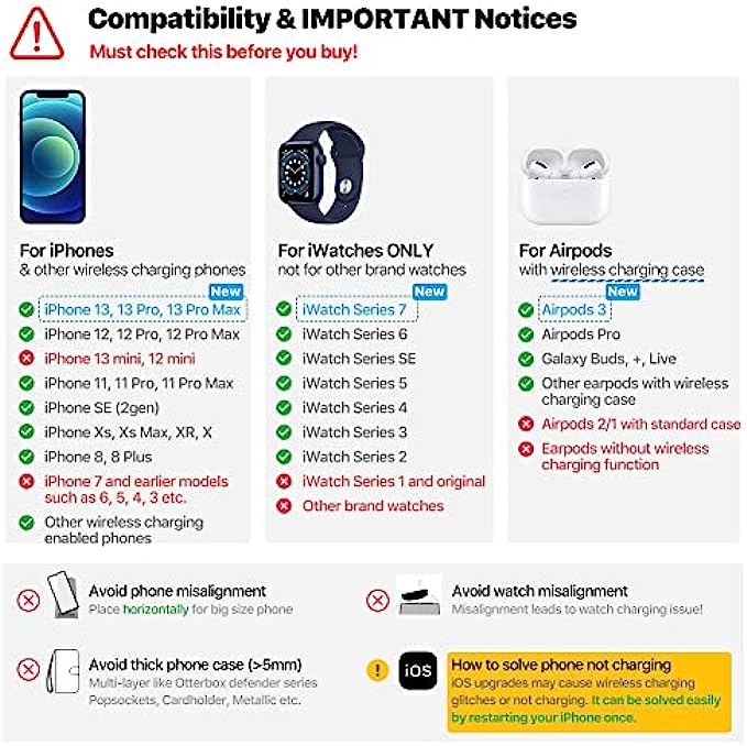 • 【Universal Compatibility】 Qi standard, supports Apple iPhone 13/13 Pro/13 Pro Max (13 mini not supported)/12/12 Pro/12 Pro Max(12 mini not supported)/11/11 Pro/11 Pro Max/XS/XR/XS MAX/X/8/8Plus, iWatch 7/6/SE/5/4/3/2 (s1 not supported) and AirPods Pro/3 (or 2/1 with extra-purchased wireless charging case), and other 100+ popular Qi-Enabled Phones and wireless charging earpods.(Attention: ONLY supports earpods with wireless charging cases)