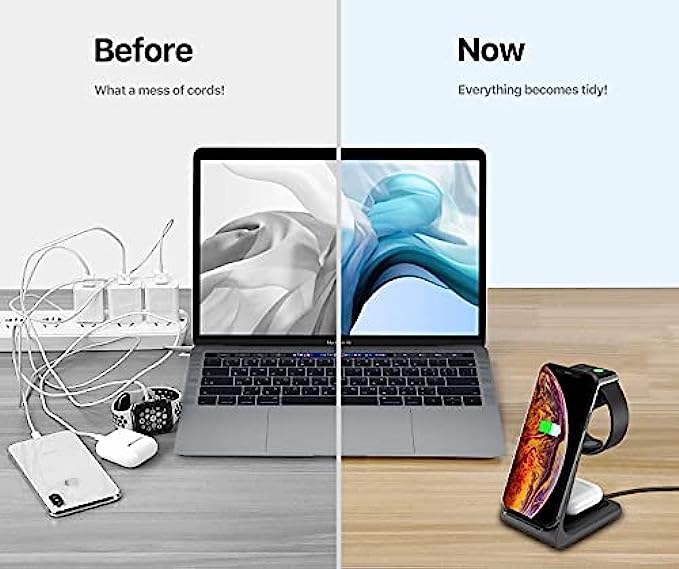 • 【Latest upgrade】The Qi-certified wireless charger stand with upgraded design and internal chip ensures safe and fast wireless charging. One charging device for your iPhone, iWatch, and Airpods. Suitable for home and office usage.(Attention: Only supports earpods with wireless charging cases)
