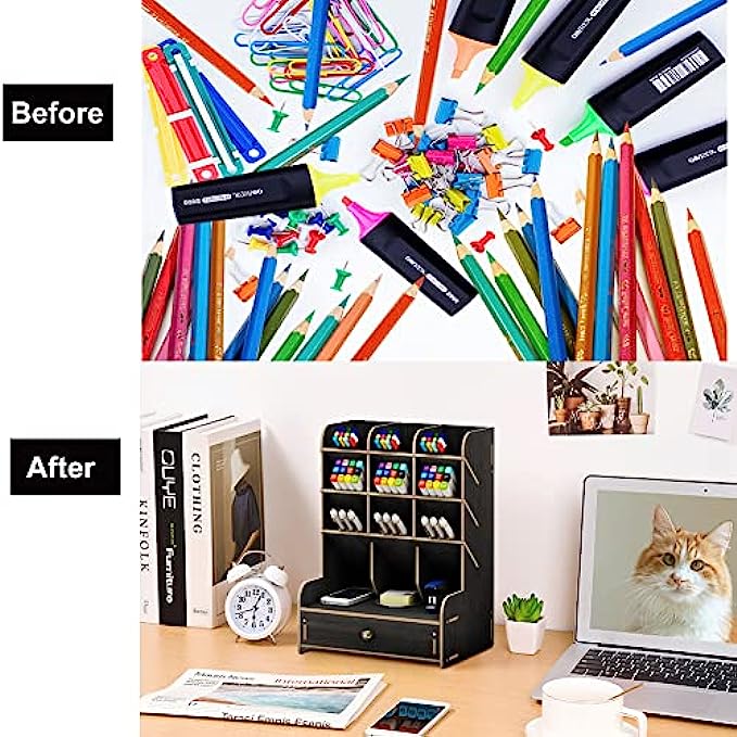 • ✎【CREATIVE DIY DESIGN】: This Desktop organizer needs to be assembled By Yourself, it's full of the joy when you assemble the desktop organizer . Installation according to the instructions or video is very simple ,made up of 15 boards to assemble,fix it with screws. A single man can easily assembly it within 20 minutes. Instantly turn it into an eye-catching stationary.