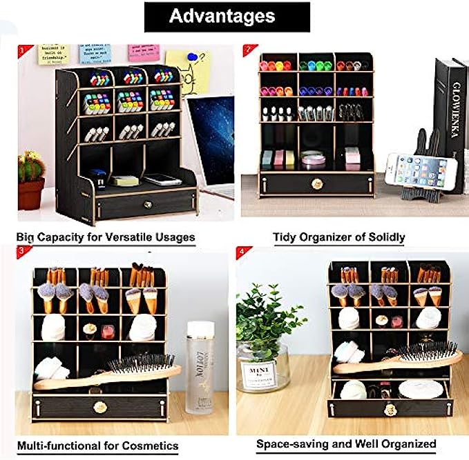 • ✎【STAY ORGANIZED】: Set of 12 compartments with a drawer, large capacity ,The desktop organiser shelf is fixed with the screws, which can tightly connect the separate parts. No need for any auxiliary tools, no fiddling around with sachets of glue. Multifunction and help you arrange the desk gadgets and stationary clean and tidy . The best and safest storage option for you. Perfect Size: 8.2*5.9* 10.0inch .