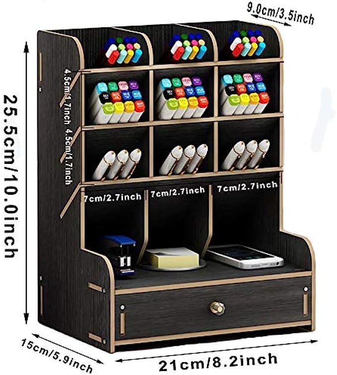 Marbrasse Wooden Pen Organizer, Multi-Functional DIY Pen Holder Box, Desktop Stationary, Easy Assembly, Home Office Art Supplies Organizer Storage with Drawer (B11-Black)