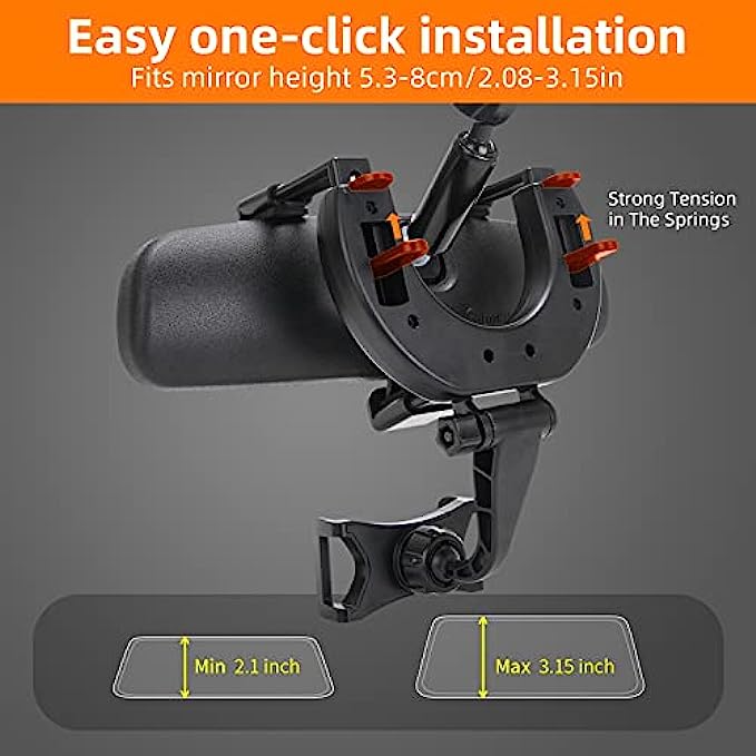 • Widely Compatible Cell Phone Automobile Cradle: The car holder for cell phone extendable clamps can clip to different thickness(2.2-5.2cm/0.86-2.04in) & height(5.3-8cm/2.08-3.15in) of rear view mirrors, and perfectly fit most vehicles such as trucks, pickup trucks & SUVs (not for rear view mirrors with a row of buttons or thickness more than 2.04”)