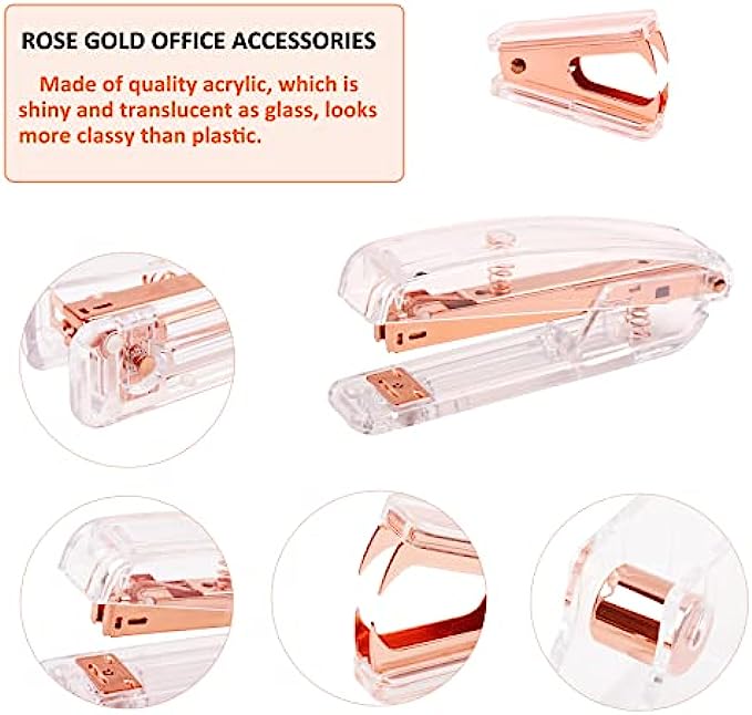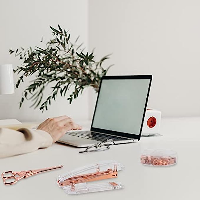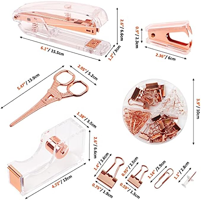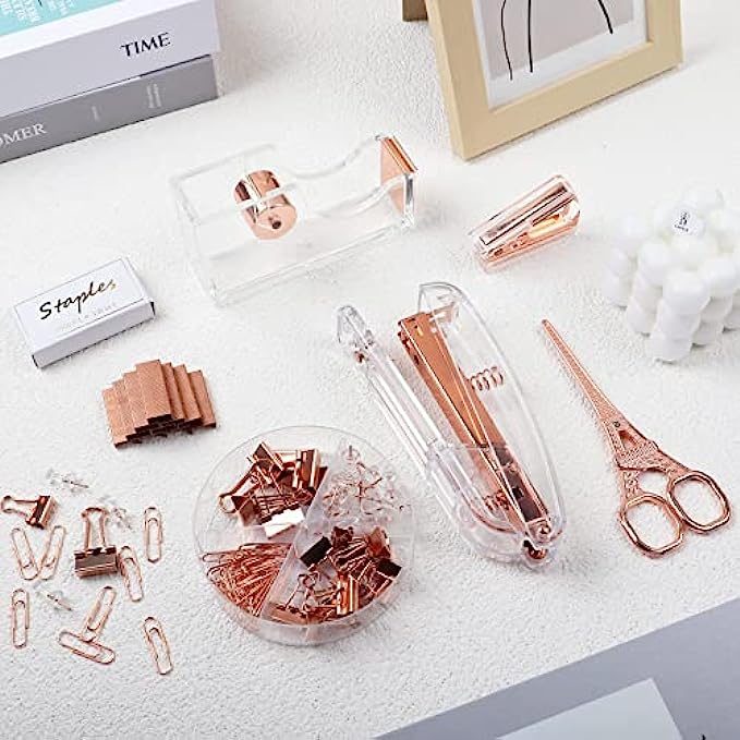 • ?ROSE GOLD DESK ACCESSORIES INCLUDES -- 1* Stapler , 1* Tape Dispenser, 1* Rose Gold Scissors, 1* Mini Stapler Removers, 7* 0.75" Binder Clips, 15* 0.59" Binder Clips, 30* Paper Clips, 20* Push Pins and 1000* Staples