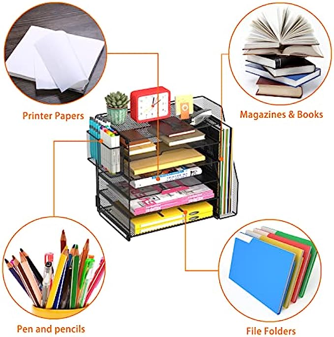 • Unique 5+1+1 Shelves Design: 5 Tier sliding trays are perfect for storage all your A4/letter sized papers and file folders, 1 vertical magazine rack is ideal for place your other books and magazines, 1 pen holder is ideal for organize all your pen and pencils.