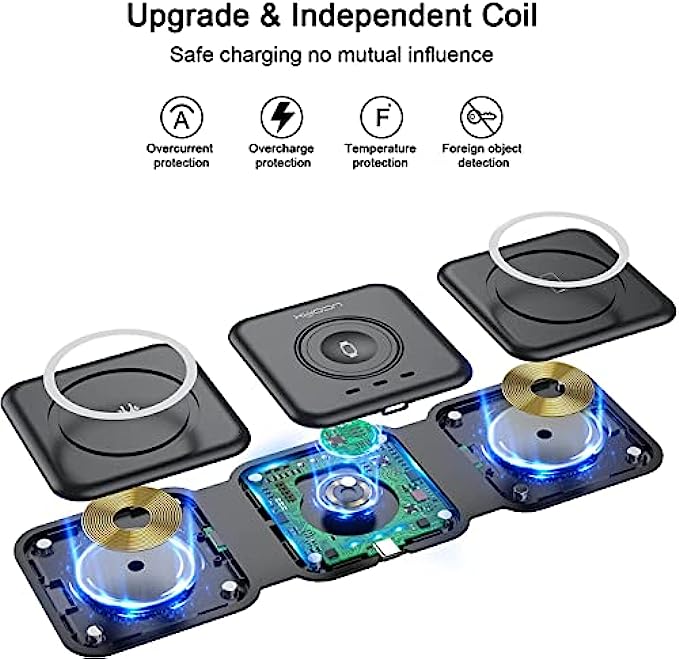 • Pay Attention to Safety and Health: Many other wireless chargers do not take anti-electromagnetic measures, and internal radiation will spread and cause harm to the human body. This folding charger adopts professional magnetic isolation sheet, no radiation, and can be used by the elderly and children to protect the safety of you and your family. In addition, when the temperature exceeds 104 ℉, charging will be interrupted to avoid battery damage and fire.