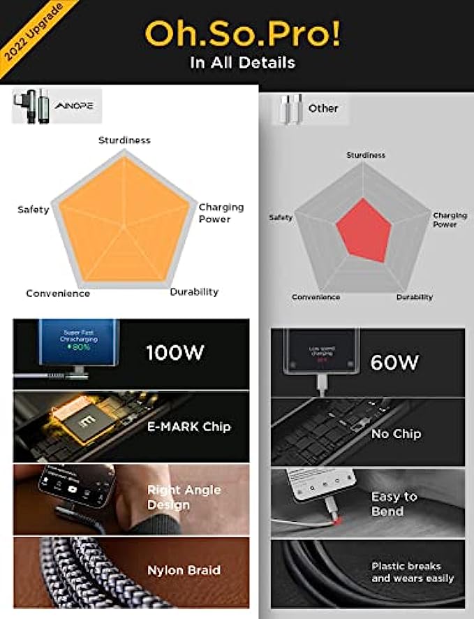 • ?2022 Upgrade 100W E-Mark Chip, 6X Faster : 100W super fast charging usb c cable to usb c is built in the best power delivery Certified E-Mark dual chip, which turbo charge supports USB PD fast charging and provides comprehensive protection to devices battery and adapters, keeping you in light-speed charging and safe. AINOPE is born for safe and fast charging. Please note: This 100W USB C cable data transfer needs to pass through the USB 2.0 USB C port.