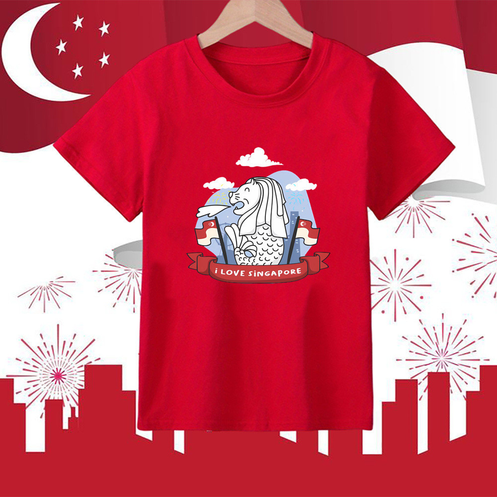 I Love Sg Cute Tie Pattern Print T-shirt Singapore National Day Children Outfit National Day Boys Girls Clothes