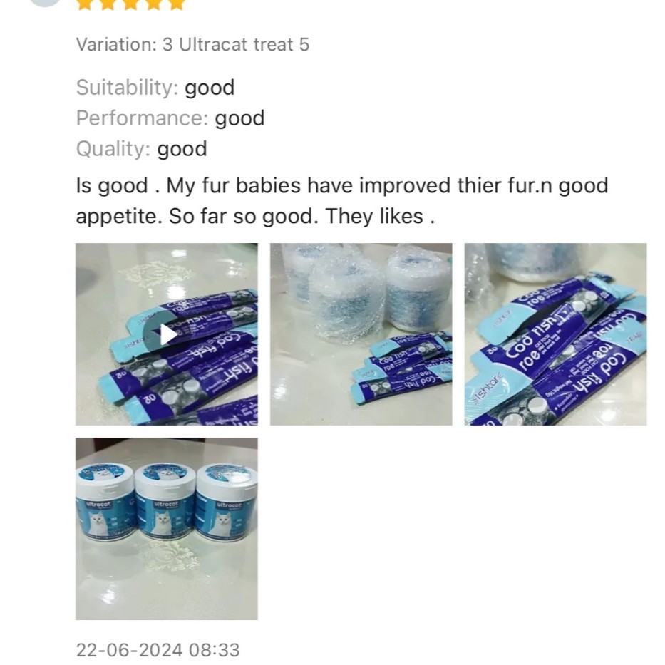 Quality:good! Performance:good! Suitability:good! My cats loved it! 3rd purchased because its suitable for my cats and they loved it! Saw the changed and benefits in my cats. Really helped my underweight cat with her appetite. Thanks seller! & its cheaper compared to other seller. Will buy again! ☺️