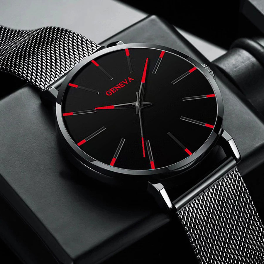 Material Quality:plastic body. metallic strap Colour:black. red trimming on the watch face.